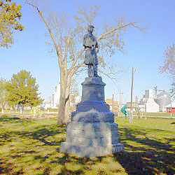 Description: Zinc Statue, mounted on a granite base. Approximately 12′ tall. The base is inscribed: “In Memory Of The ~ Heroes Of ’61 – ’65 ~ May The Deeds Of Valor Of ~ Them And Their Comrades ~ Forever Inspire Love Of ~ Liberty And Country ~ Erected By The ~ G.A.R. The W.R.C. And ~ Citizens ~ Of Bronson, Kansas ~ 1907.” The other sides of the base have various raised medallions and patriotic symbols.