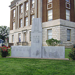 Description: The center portion of this monument is inscribed: “In Honored Memory ~ of Those From ~ Bourbon County ~ Who Gave Their ~ Lives for Freedom” and”In Memory of Those Who Gave ~ Their Lives that our Nation ~ might Live. This monument ~ was erected A.D. 1947 by ~ Charles W. and Clara A. Bruce” The side panels are engraved with names and the identifiers “1917, World War I, 1918” and “1941, World War II, 1945”.
