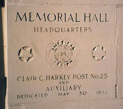 Description: This marker, in the Fort Scott Memorial Hall reads: “Memorial Hall ~ Headquarters ~ Clair C. Harkey Post No. 25 ~ and ~ Auxiliary ~ Dedicated May 30, 1932.