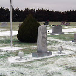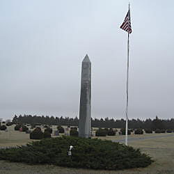 Description: A tall granite spire is mounted at the center of the cemetery. The inscriptions on the monument include: “For God And Country They Died ~ That We Might Live”, “The Following ~ Served In ~ World War I ~ {names}”, “The Following ~ Served In ~ World War II ~ {names}”, and “The Following ~ Served In ~ Korean War ~ {names}”.