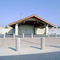 Description: Central to the Kansas Veterans Cemetery is a large pavilion. The arch just below the roof states: “No One Is Ever Buried Alone, All Are Buried With Honor”. Seals of the Army, Navy, Air Force, Marines, and Coast Guard are on the back wall.