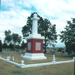 Description: Painted concrete monument with inscriptions: “G.A.R. ~ Cemetery ~ 1887″, In Memory Of ~ Comrades ~ That Lie In The ~ Southland ~ In Unmarked ~ Graves”, “In Memory Of ~ Our ~ Countrys’ ~ Defenders”, and a carved GAR medal.