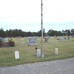 Description: Three headstones are grouped next to the cemetery flagpole to form a dedication area. All three are Civil War veterans but Bronze medallions are placed behind each grave. The medallions are inscribed: “Veteran ~ 61-65”, “American Legion”, and “WW II”.