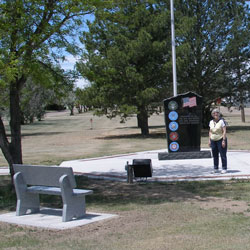 Description: A granite monument is emplaced on a plaza next to a flagpole and several benches. The front of the monument is inscribed: “Dedicated to all ~ the men and women ~ who have honorably ~ served our country”. The reverse includes: “To those who died, honor and rest; ~ to those still in bondage, remembrance ~ and hope; and to those who returned, ~ gratitude and peace.” “This memorial is dedicated in honor ~ of the valiant men and women of ~ Greeley County, Kansas, who ~ rendered unyielding service ~ to the cause of liberty in ~ declared and undeclared ~ wars to keep the United ~ States of America a free ~ and great nation”. The benches carry the inscription: “VFW Post 7521 American Legion 311”.