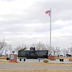 A small brick monument with a granite inset identifies this as “Western Kansas ~ Veterans Memorial ~ And Directory ~ Dedicated ~ November 11, 2003”.