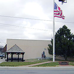 Description: A brick monument with a bronze plaque identifies this as “Hamilton County ~ Veterans Park ~ Dedicated To The Men And Women Who ~ Have Served And Will Serve In The Armed ~ Forces Of The United States Of America.” The painting on the wall behind the flagpole is of a cavalry soldier.