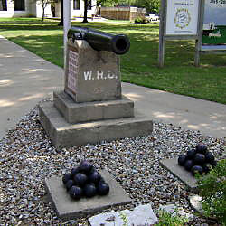 Description: Cannon replica on concrete base, pointing SW. Base may be original; granite panel inset on SE face of base reads: “Dedicated ~ In F. C. & L. ~ To The Union ~ Soldiers & Sailors ~ Of The War ~ 1861-1865”. A gray limestone(?) panel bolted onto the NE face of the base reads: “Civil War Cannon ~ Replica ~ By ~ Holton National Guard ~ V.F.W. & Amer. Leg. ~ Courtesy Of ~ Denison & KS. State Banks ~ People Of Jackson County ~ Orig. Cannon Donated To ~ W.W. II Scrap Drive ~ Sept. 8. 1942 ~ A Bicentennial Project”.