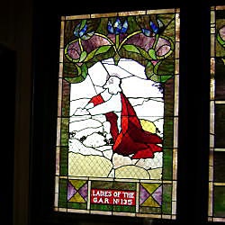 Description: The Chapel at the cemetery has a cornerstone reading: “Erected By The ~ People ~ Of ~ Holton & Vicinity ~ 1913”. In the chapel is window dedicated the “Ladies Of The ~ G.A.R. No. 135”. Some of the color on the window has faded badly.