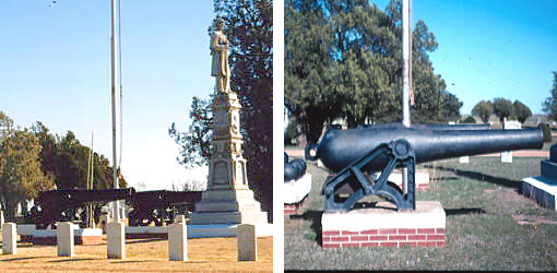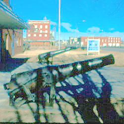 Description: Two 32-pdr Shell Guns mounted on metal stands. Both cannon bores are plugged with concrete.