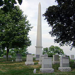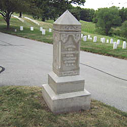 Description: A tall granite spire is central to the Leavenworth National Cemetery. The inscription at the base of the spire reads: “In Memory ~ Of The Men Who Offered ~ Their Lives In Defense ~ Of Their Country”.