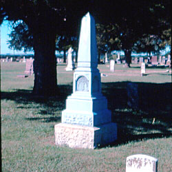Description: A square granite spire with a pointed cap is mounted on a pedestal and surrounded by small trees and a low fence. The inscriptions on the monument read: