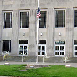 Description: In front of the Auditorium is a flagpole with a broad round base. Embedded in the top of this base is a plaque indicating the flagpole was a project of the 1976 U.S. Bicentennial. Also embedded in the flagpole are bronze plaques with the logos of the G.A.R., the United Spanish War Veterans, the VFW, and the American Legion.