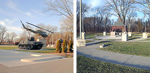 Description: This large memorial park has a mounted helicopter and tank along with a variety of monuments, flagpoles, and plaques. The plaque at the entry reads: “In Honor of ~ Those Who Have Served ~ in the Armed Forces of ~ the United States ~ of America”.