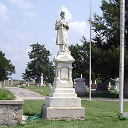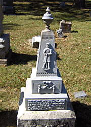 Description: A soldier at parade rest is mounted on a stone pedestal. An inlaid marble plaque features crossed rifles, a flag, crossed sabers, a fouled anchor and a field artillery piece. The accompanying inscription reads: “On fames eternal camping ground ~ Their silent tents are spread. ~ While glory guards with solemn sounds ~ The bivouac of the dead.”