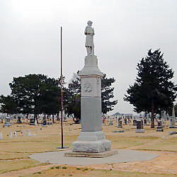 Description: A Granite soldier statue, with the soldier at parade rest, is mounted on a square granite column. Around the top of the column are carved emblems representing the GAR Badge, soldiers accoutrements, crossed swords with a victory wreath, and crossed rifles.