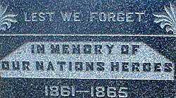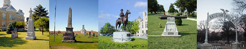 Memorials may be in any of a number of styles, sizes, materials, and dedications. They may be markers in cemeteries, pavilions, statues, bronze tablets, cannons, drinking fountains, benches, or buildings. Dedications may be very specific (“to those who died in the battle of Westport”) all inclusive (“to those who served their country”), or may just be a saying (“lest we forget”). They may be closely identified with one of the service groups (“dedicated by Post 216, G.A.R.”) or have no identification. They may be at County Courthouses, City Parks, Cemeteries (both large and small), schools, or almost anyplace. This list organizes memorials into the following categories: