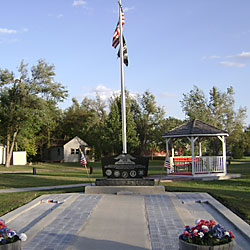 Description: The black granite stone mounted in the center of the park is inscribed: “Honor – Memory ~ “The willingness to sacrifice is the prelude to freedom” ~ This memorial is dedicated with appreciation to the men and women ~ whose loyalty and service during times of war and peace define ~ the character of this great nation ~ (seals of the branches of the modern armed forces) ~ This memorial has been made possible by veterans and families of White City and surrounding area”. The reverse is engraved with “Freedom ~ is not free”.