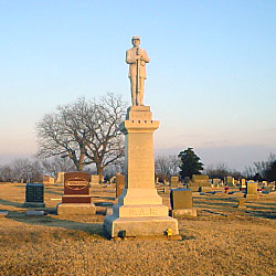 Description: Granite monument – thirty-two feet high, with a full-size private soldier at parade rest on the top. The inscription on the monument reads: “In Memory ~ Of The ~ Soldiers And Sailors ~ Of The War Of ~ 1861-1865 ~ Erected May 30, 1907 ~ Under The Auspices Of ~ Erie Post No 311 ~ Department Of Kansas”.