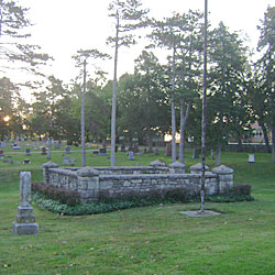 Description: Memorial Day platform and flag pole. (Just past the first small stone culvert, then first road on the left, before the Wareham mausoleum.) A plaque at the base of the flagpole is engraved: “Erected in 1934 by the R.B. Spilman Camp of the Sons of Union Veterans.”