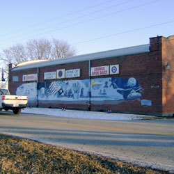 Description: A large mural is painted on the side of the American Legion, Post 400 Hall. The inscription reads: “Dedicated to all veterans ~ American Legion Auxiliary ~ Unit 400 ~ 2001”. Next to the hall is a small memorial park with a World War II tank and dedications to the Auxiliary and past commanders.