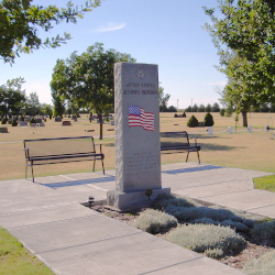 Description: A granite monument is inscribed with a colored picture of a US Flag. Above the flag is inscribed: “United States ~ Veterans Memorial”. Below the flag is the inscription: “Dedicated To ~ Those Men & Women ~ Who Served In The ~ Armed Forces Of The ~ United States Of America”.