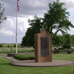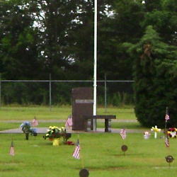 Description: A small plaza is in the center of the cemetery. A polished gray monument is inscribed “Lest We Forget”. There is also a flagpole and bench. The bench is inscribed: “In Memory Of Glenn & Harriett D. Smith ~ A Place To Be Alone With Your Memories”.