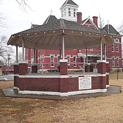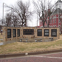 Description: A brick pavilion is erected as a stage. The East side has an inscription reading: “Memorial ~ A Tribute To ~ Woodson County’s ~ Soldiers And Sailors ~ Of The World War ~ And Veterans Of ~ All Wars U.S.A.”