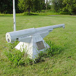Description: A cannon tube is mounted on a concrete pedestal. The attached plaque reads: “May 30 (VFW Seal) 1937 ~ In Memory Of The ~ Wyandotte County Veterans ~ Who Made ~ The Supreme Sacrifice ~ Adams Petersen Switala Post No 111 ~ Veterans of Foreign Wars Of the U.S.”